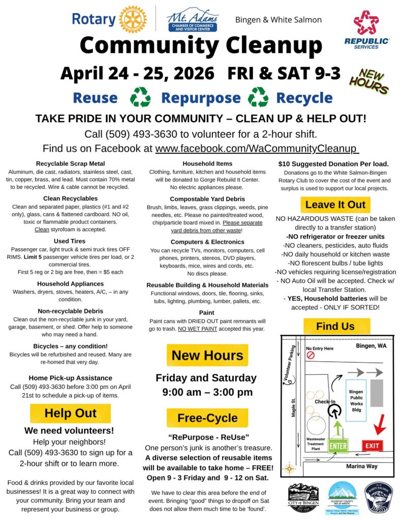 Information about upcoming community events can be found on the GorgeCurrent Events Calendar and also on the Mt. Adams Chamber of Commerce Events Calendar.